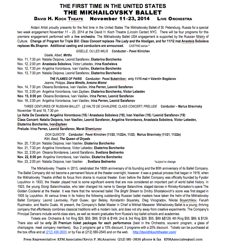 Here is a casting update for Mikhailovsky Ballet, performing at Koch Theater, Lincoln Center from November 11-23. I look forward to seeing Leonid Sarafanov; I’ve seen him on YouTube video, but never live. Also, Ivan Vasiliev and Natalia Osipova in Don Quixote. Should be a lot of fireworks.